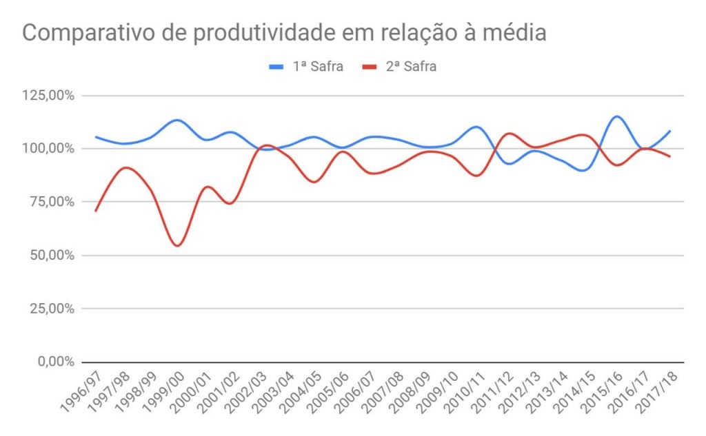 Atenta-se, portanto, para o dado 100% de produtividade na Figura 2, este valor representa a média de produtividade entre a 1ª e 2ª safras referentes ao ano-safra.